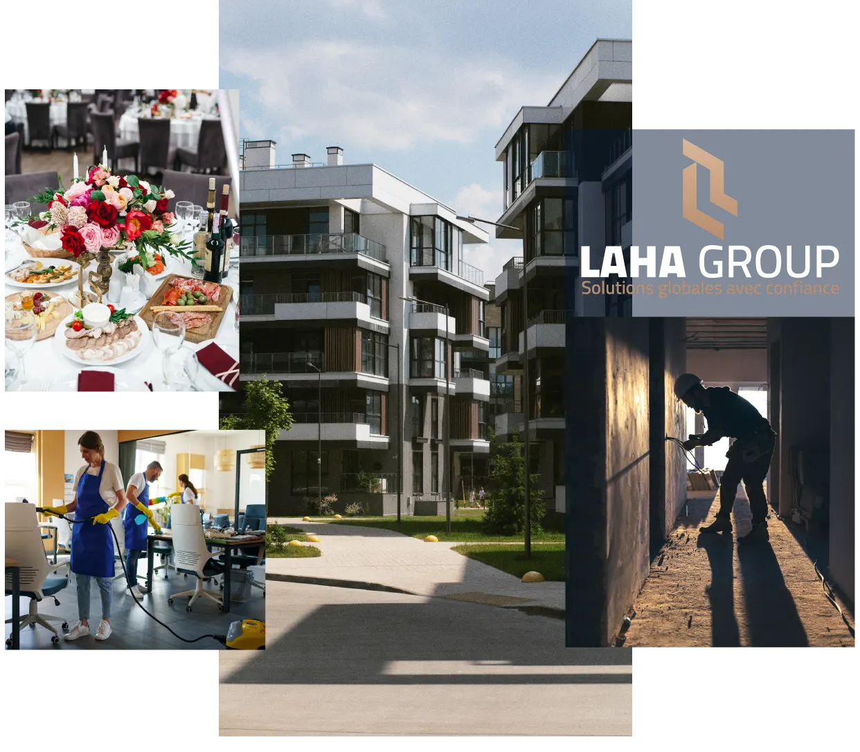 Laha Group est un groupe multiservices qui s’engage à fournir des solutions innovantes et de haute qualité dans plusieurs secteurs clés : la construction, la rénovation, les services professionnels tels que le nettoyage, le traiteur, l’événementiel, et l’immobilier